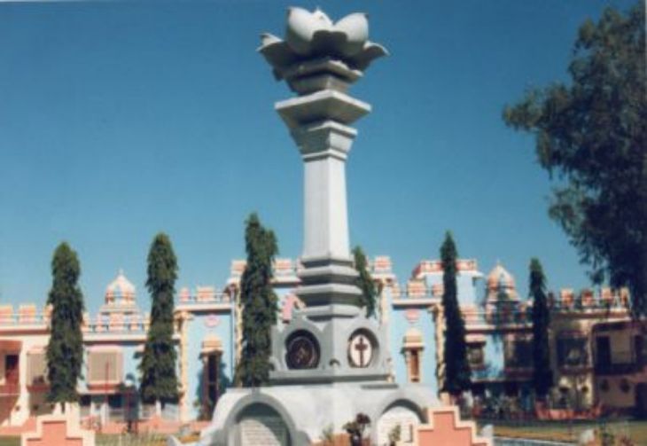 Colonne du SARVA DHAMA symbole de l'unité de toutes les religions devant la maison de BABA