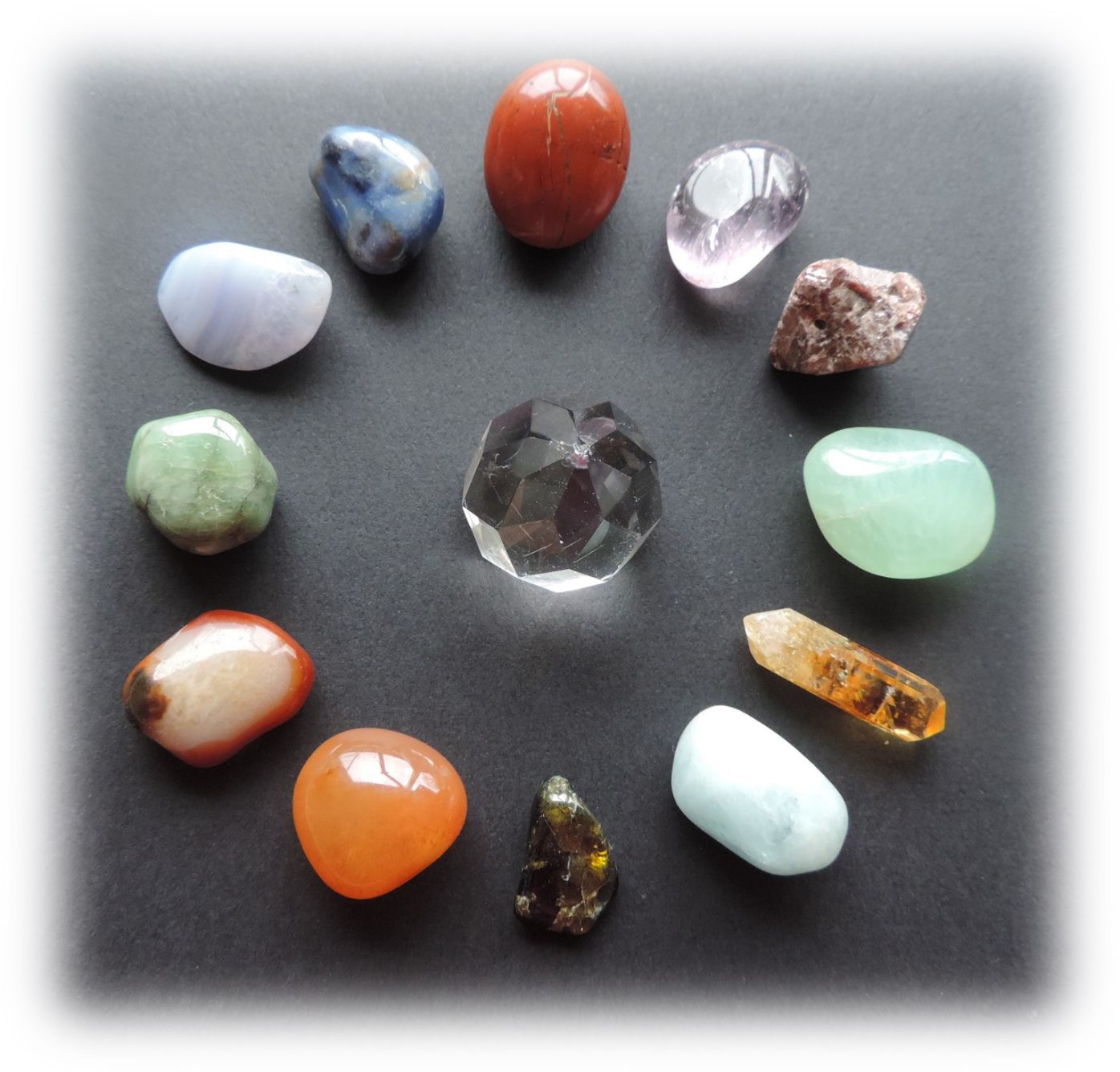 Le Jaspe (la tête), la Calcédoine (l'ouïe), l'Emeraude (le système digestif), la Sardoine (les intestins), la Chrysoprase (les genoux).