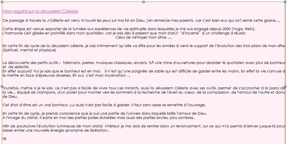 La Jérusalem Céleste, chemin de vie, m'a accompagné dans beaucoup de mes activités terrestres, qu'elles soient liées à la terre elle-même, ou à l'aliment terrestre, à mon corps physique, ou à mes pensées.